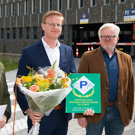 Erwin Lund, senior project manager development at Interparking Nederland, received on May 28th the ESPA Gold Award for the Willemspoort parking garage from Peter Dingemans, vice chairman of Vexpan. This award is the distinction for parking garages of exceptionally high quality, safety and customer friendliness and is awarded and presented in the Netherlands by Vexpan; the leading platform for parking in the Netherlands.
