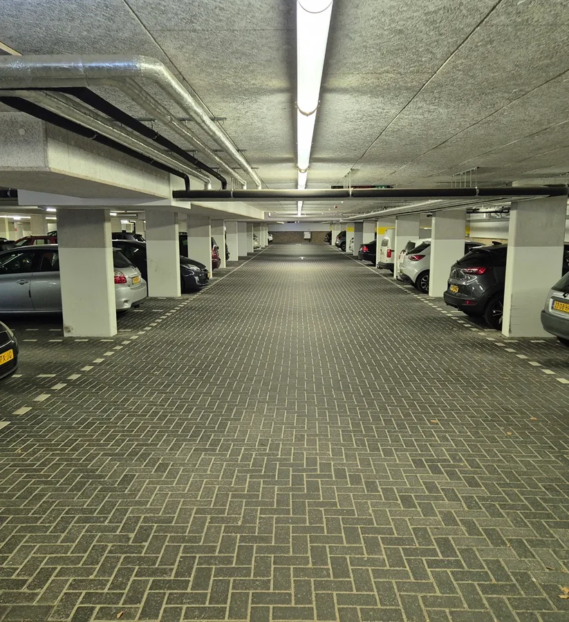 De garage biedt 96 parkeerplaatsen, waaronder 4 mindervalidenplekken en 3 oplaadpunten voor elektrische auto’s.