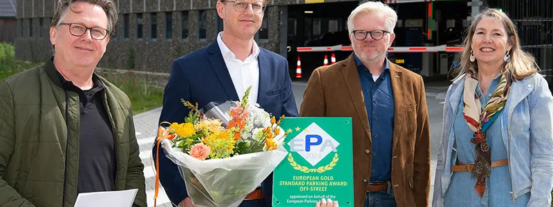 Afbeelding: uitreiking award ESPA Gold award. V.l.n.r. Ciaran Dooijes, Erwin Lund, Peter Dingemans en Jolanda van Hulst- Mazirel namens Vexpan Platform Parkeren Nederland