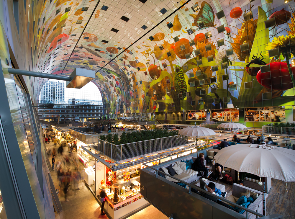 Op de plek waar Rotterdam in 1270 werd gesticht, is steen voor steen de iconische boog van de Markthal verrezen. Tijdens de bouw werden talloze middeleeuwse vondsten gedaan, zoals vazen, gereedschap en kanonskogels. Deze zijn te bewonderen in de permanente tentoonstelling De Tijdtrap. Niet alleen de buitenkant van de Markthal is spectaculair, ook binnen is er veel te zien. Kunstenaar Arno Coenen creëerde hier de Horn of Plenty, het grootste kunstwerk van Nederland. Met een kleurrijke oppervlakte van 11.000 m² wordt het ook wel de Sixtijnse kapel van Rotterdam genoemd.